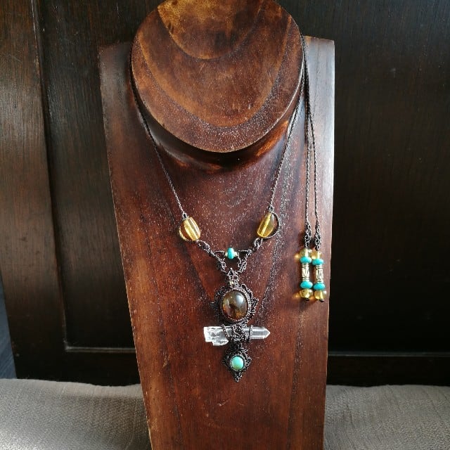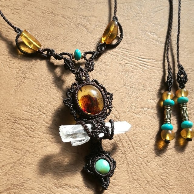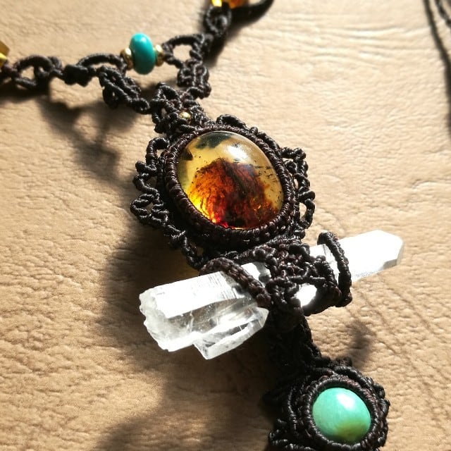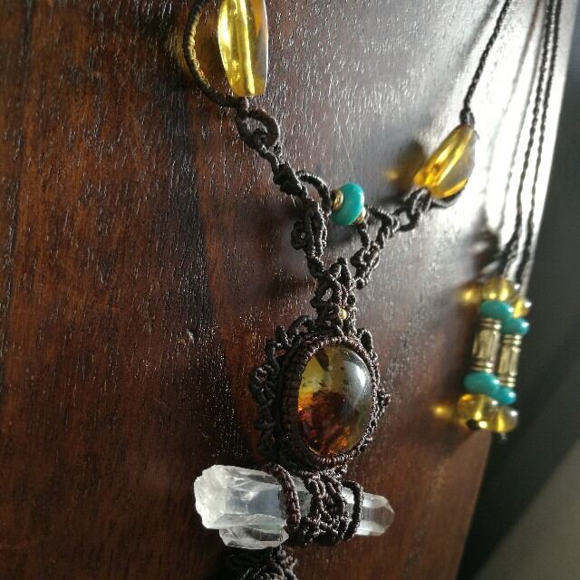 首紐装飾にも琥珀のビーズを使い、メインにはぷっくりの琥珀と透明度が高いレムリアンリッジが出ているポイント水晶、小粒ターコイズの組み合わせで、ネックレスをデザインいたしました♡