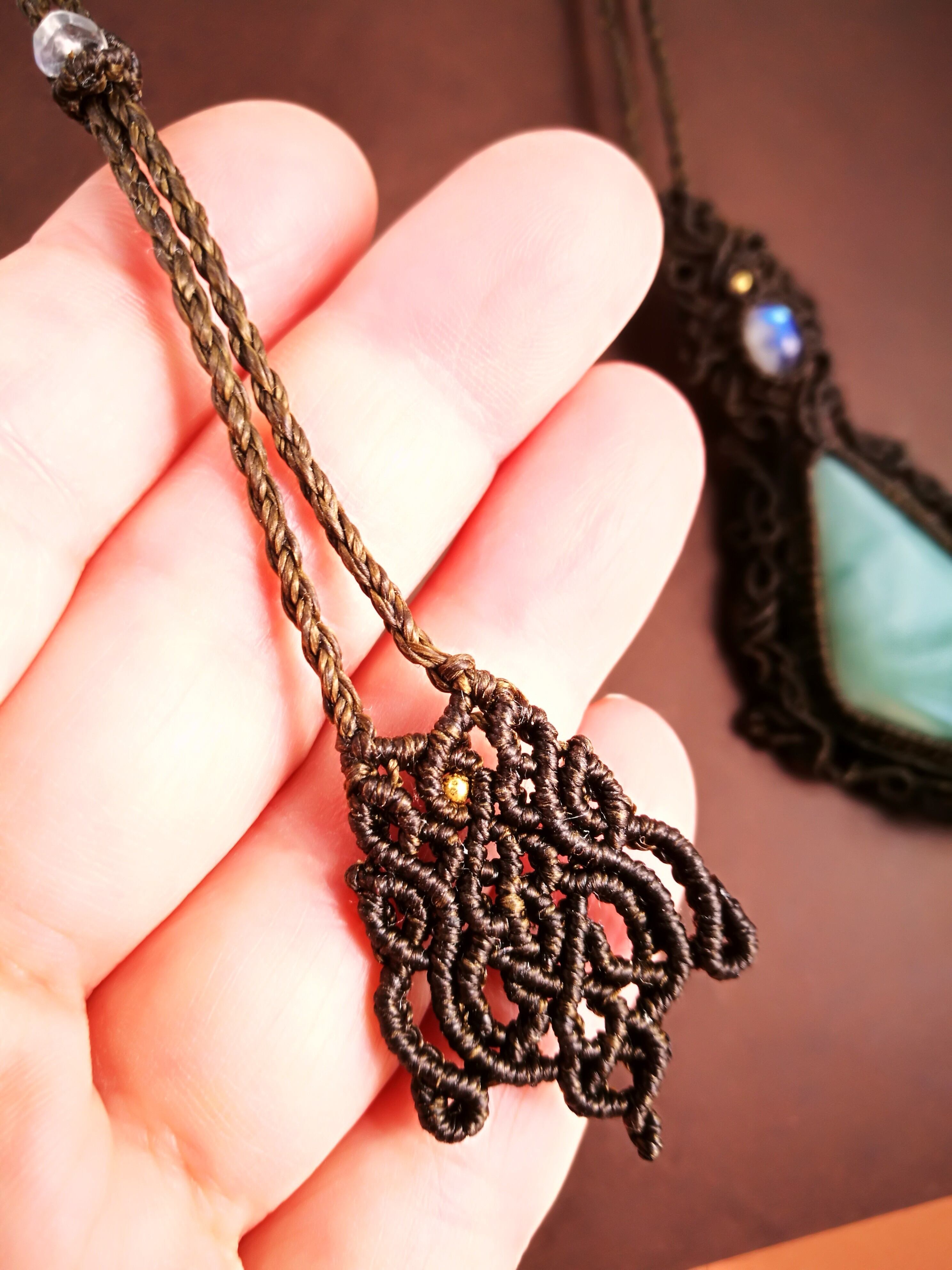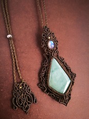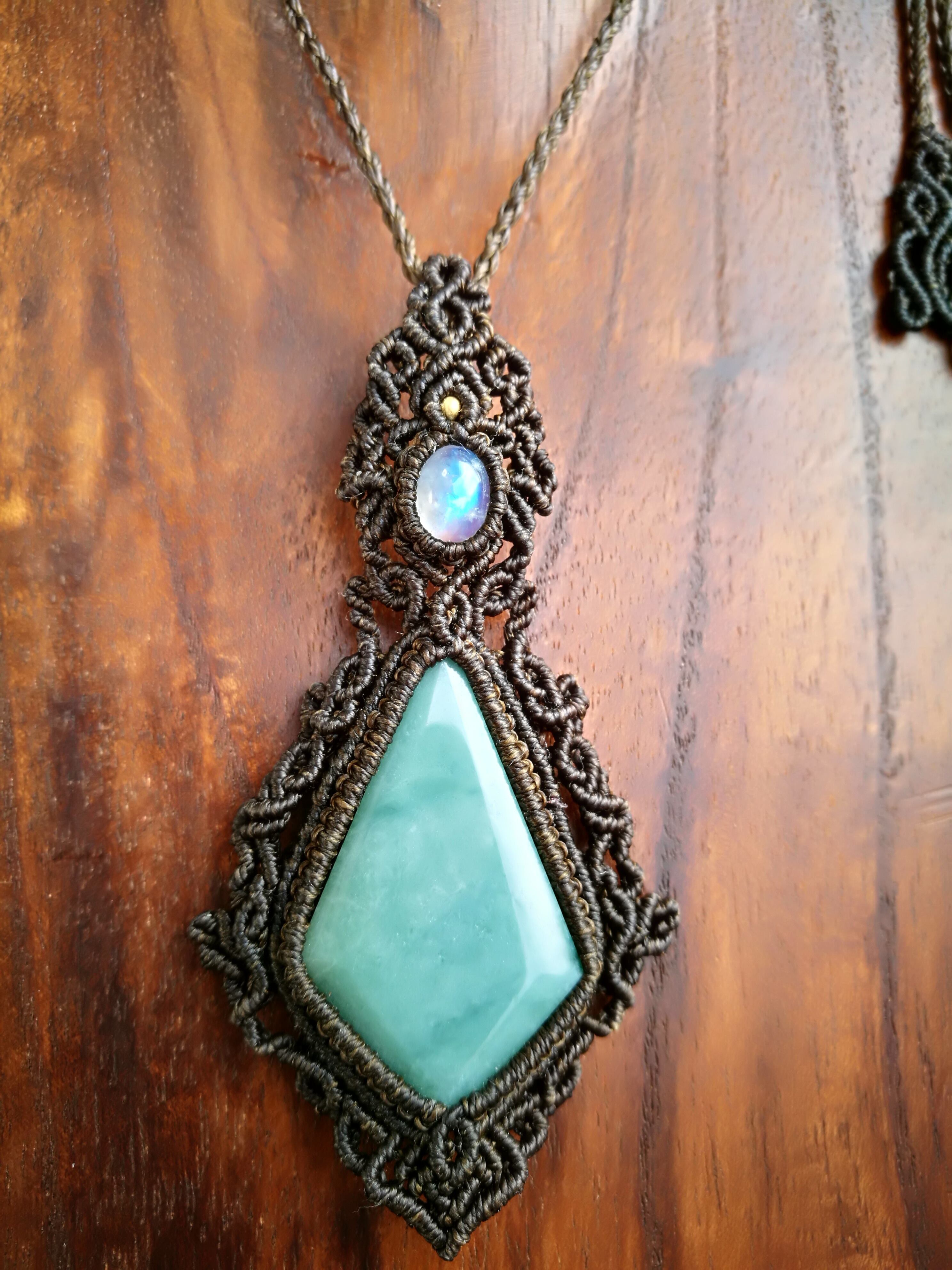 美しいカットの入った可愛いマンサナ翡翠と、シラーが美しいレインボームーンストーンでペンダントを編み上げました♡