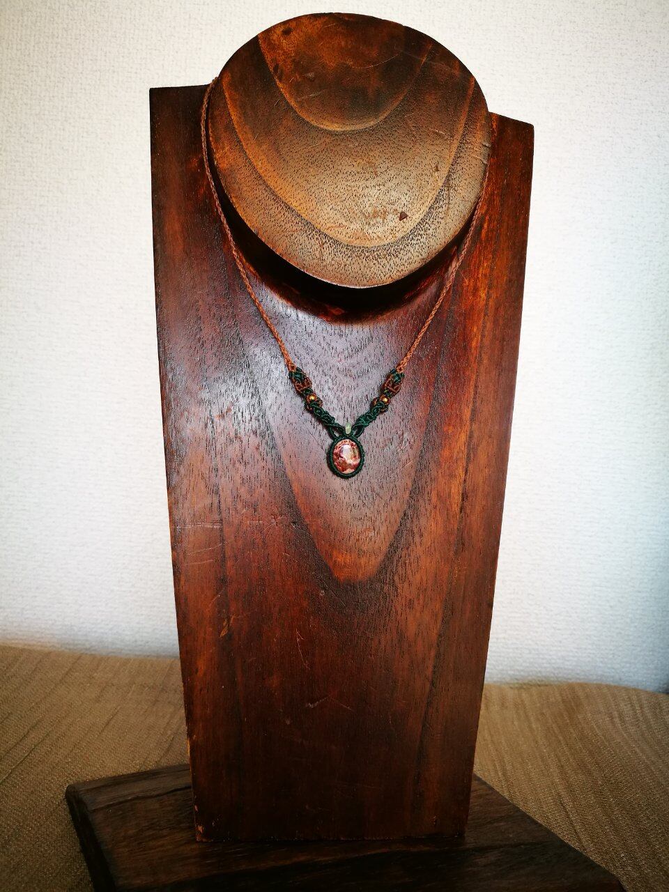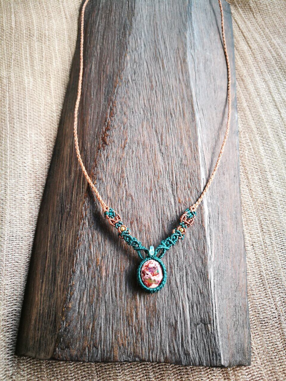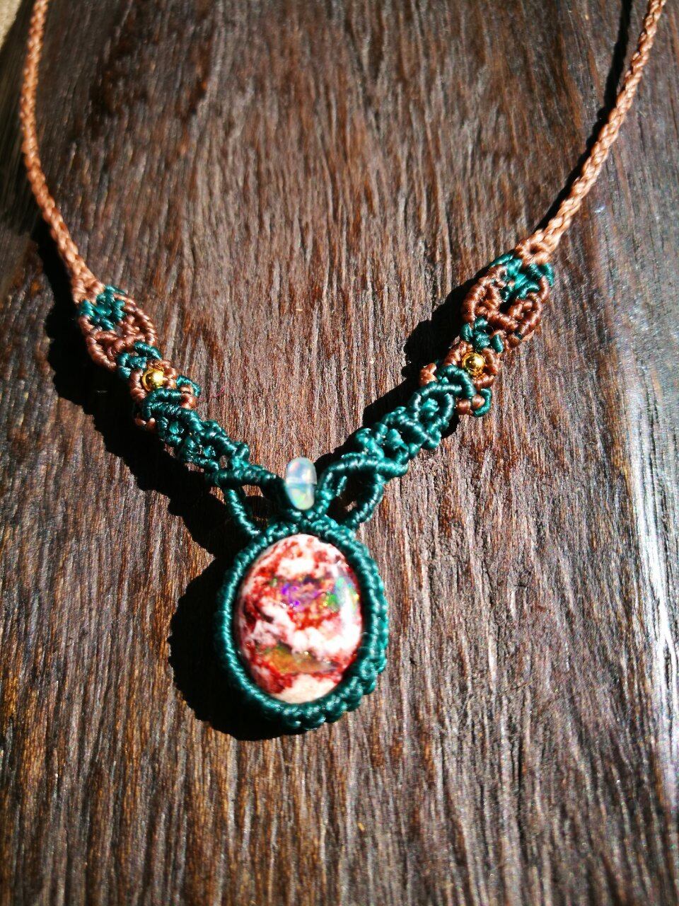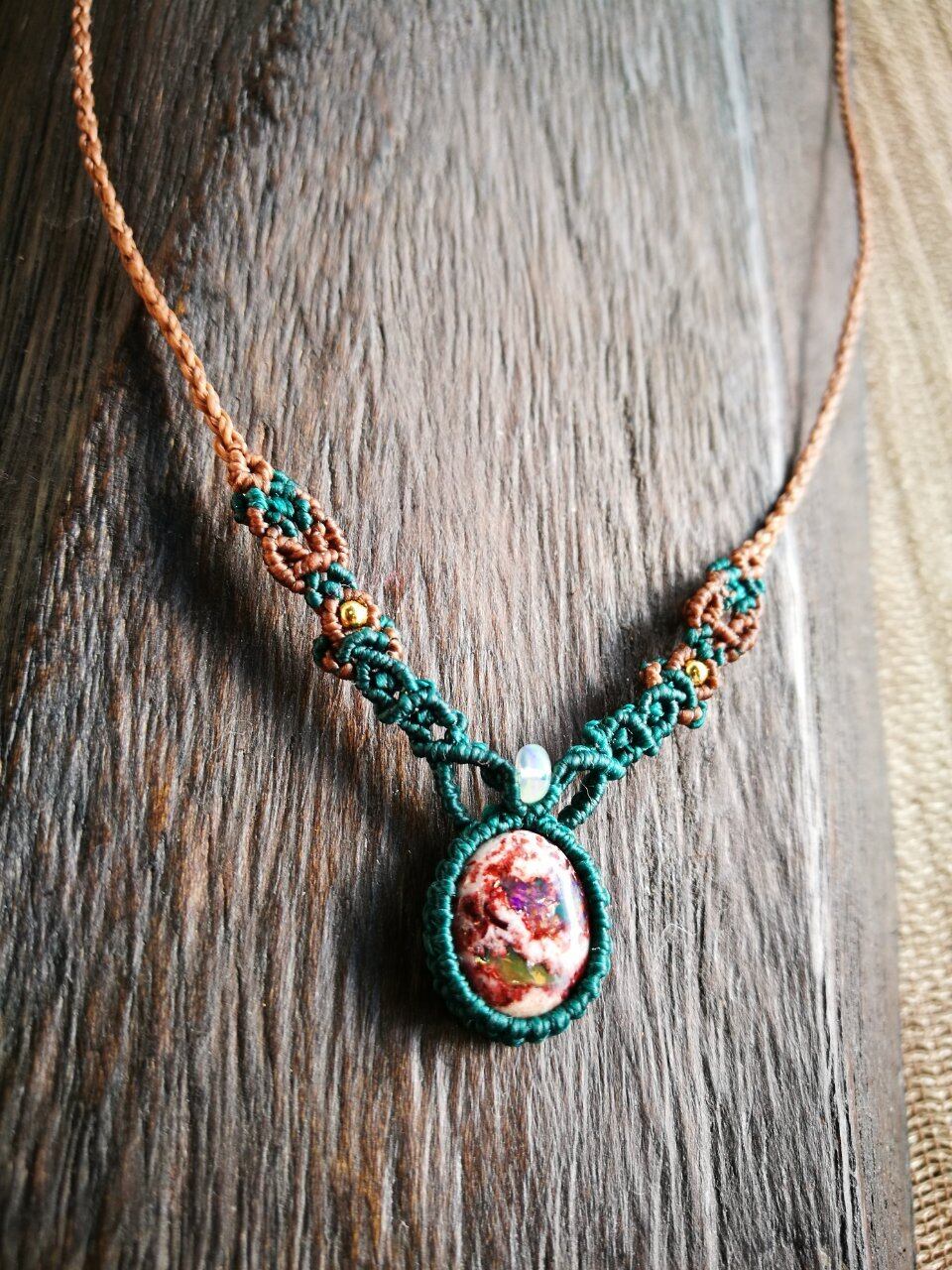 2か所から遊色をのぞかせ、母岩のブラウンのお色と、遊色のお色のグリーンを装飾する蠟引き紐にも反映させて、統一感ある個性的なネックレスに仕上げました◎
